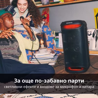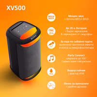 SONY SRS-XV500B е мощна безжична парти система, идеална за домашни събирания и открити събития. Оборудвана с X-Balanced вуфери за дълбок бас, 4 говорителя и множество звукови режими (MEGA BASS, LIVE SOUND, DSEE), тя доставя професионално качество на звука. С 25 часа автономност, IPX4 водоустойчивост, караоке функция и Bluetooth 5.2, системата е перфектният избор за развлечение всяде и всякога.